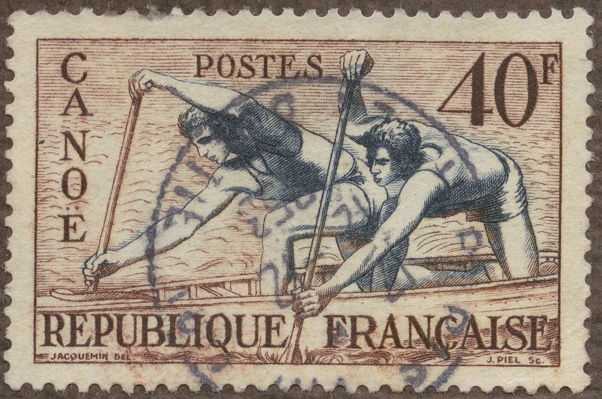 Frimärke från Frankrike, 1953. Motiv av Kanotpaddling "Serie: Olympiaden i Helsingfors 1953."