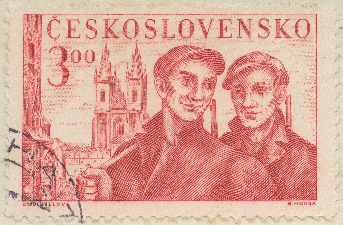Frimärke från Tjeckoslovakien, 1950. Motiv av Folk Poliser mot bakgrund av S:t Nicolaus katedralen i Prag.