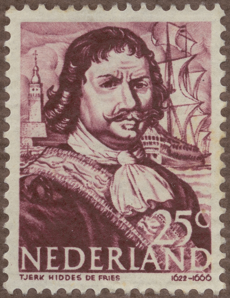 Frimärke från Nederländerna, 1943. Motiv av Tjerk Hiddes de Fries 1622-1666 Holländsk amiral "Serie: holländska amiraler."