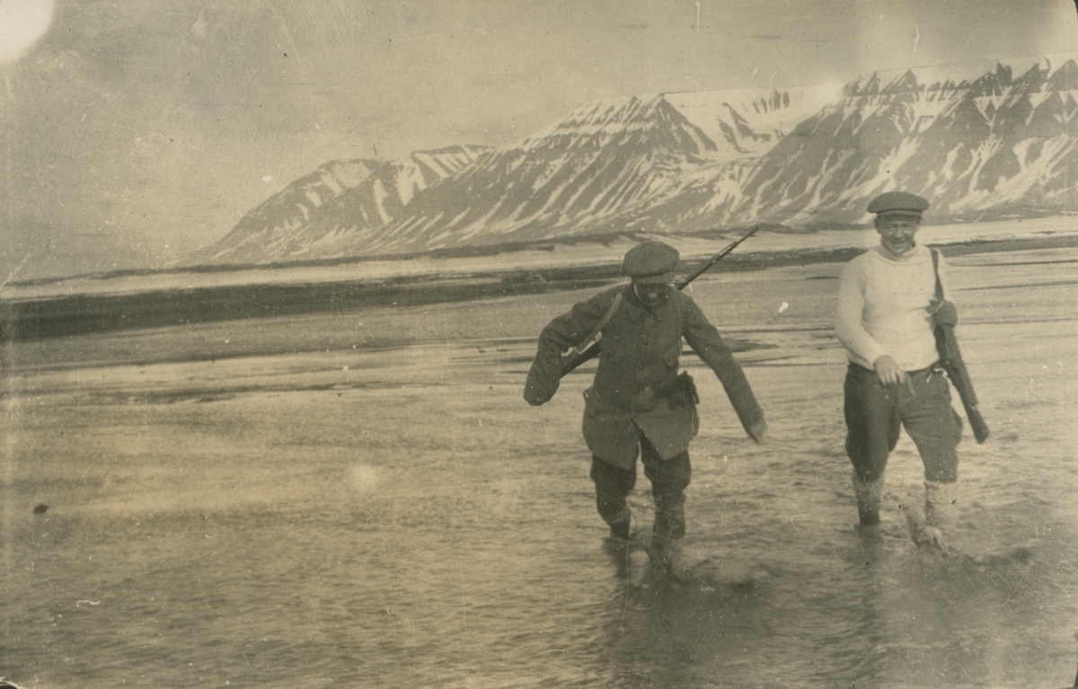 Fotografi från expedition till Spetsbergen. Motiv av två expeditionsdeltagare som vadar genom vatten. Båda två bär på gevär. I bakgrunden syns snötäckta berg.