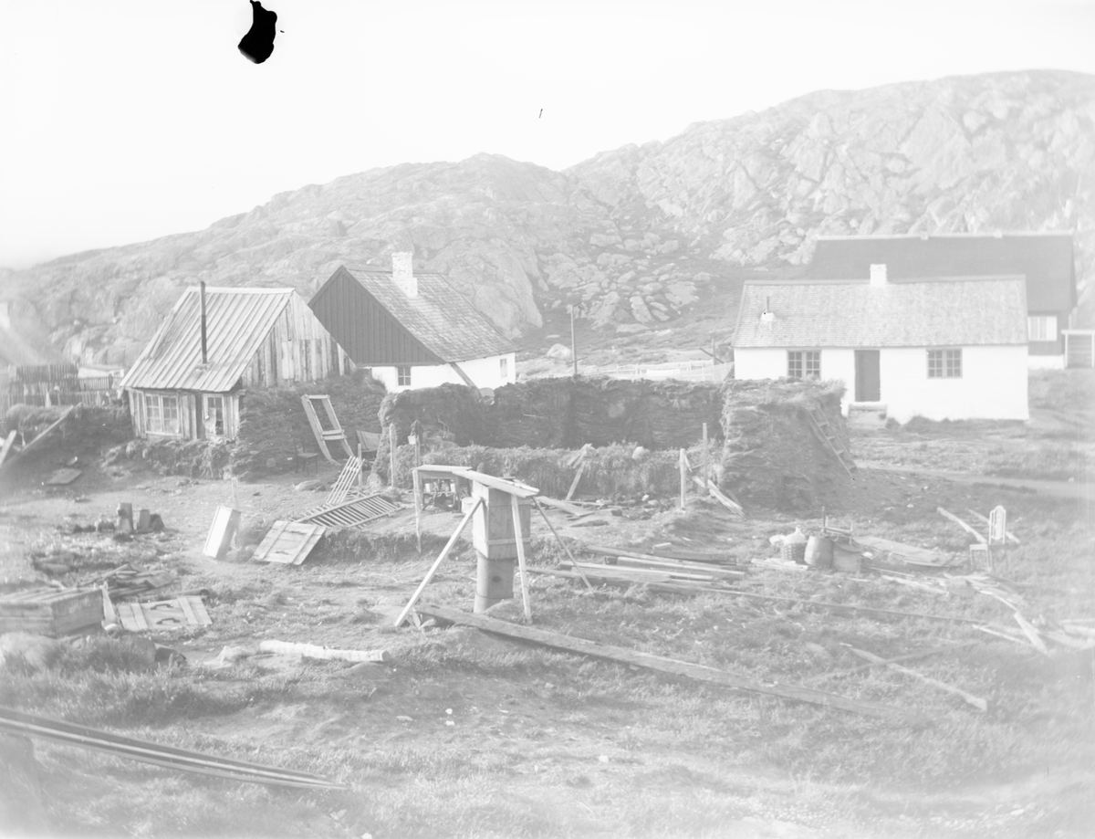 Fotografi från Grönland. Motiv av ett antal hus nedanför berg.