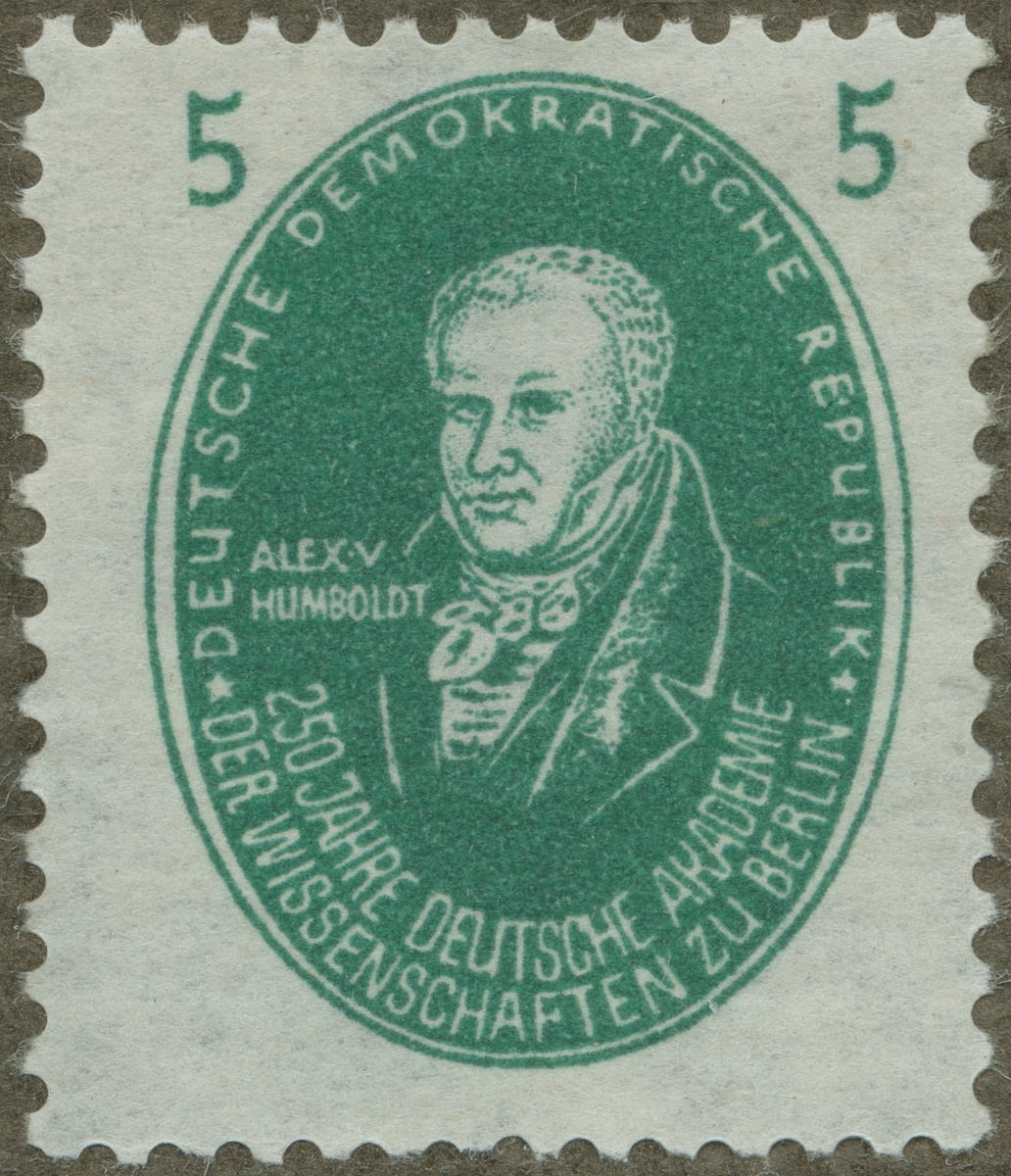 Frimärke från Tyskland, 1950. Motiv av Alexander von Humboldt 1769-1859 Naturforskare, speciellt Sydamerika Jordmagnetiska iakttagelser 250-årsminne Berlins Vetenskapliga Akademi 1700-1950.