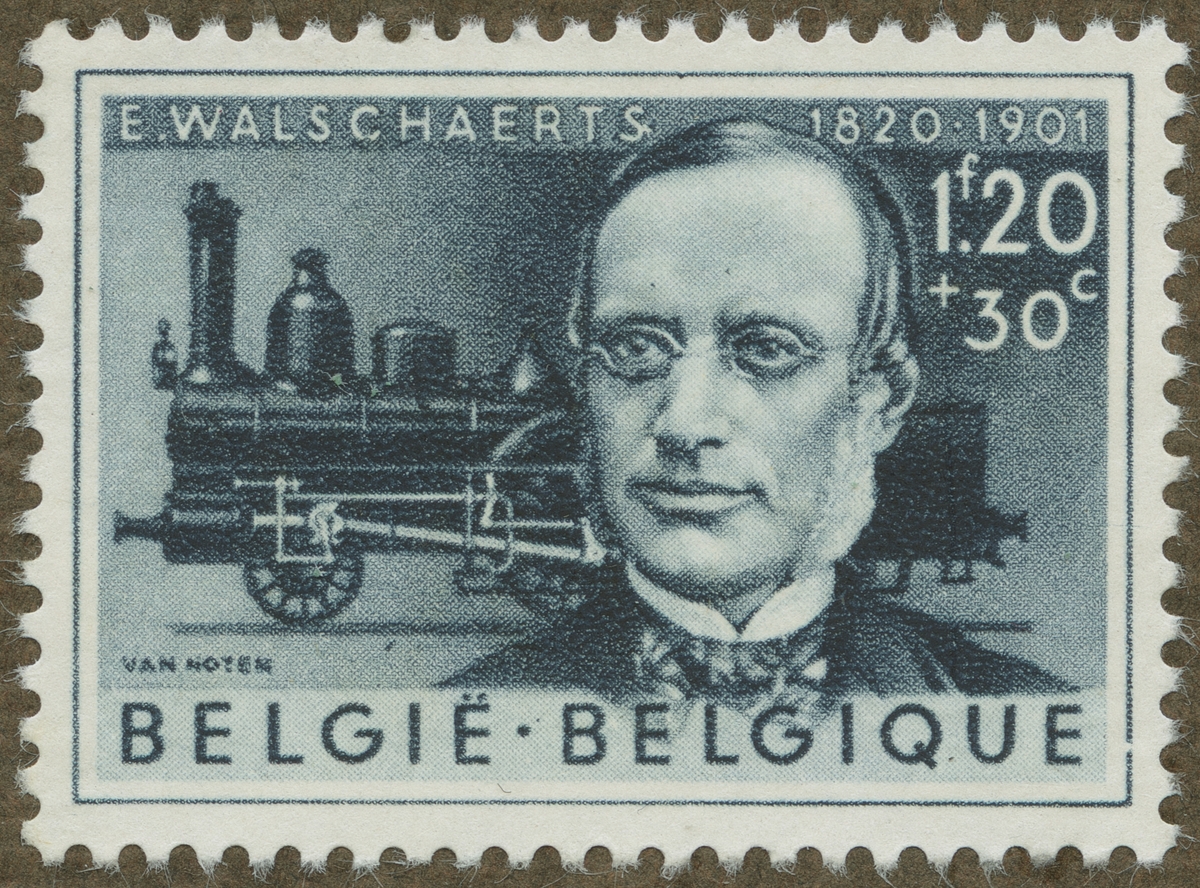 Frimärke från Belgien, 1955. Motiv av Belgiska uppfinnaren och ingenjören Egide Walschaerts: 1820-1901 konstruerade grundslid för ånglokomotiv "Serie: Belgiska vetenskapsmän till förmån för olika kulturella ändamål"