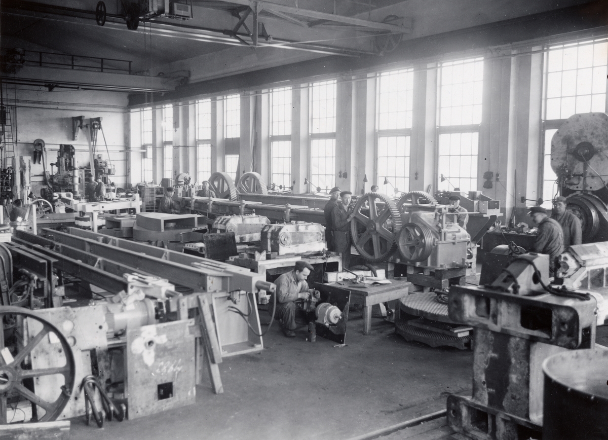 Montagehall på Arboga Mekaniska Verkstad. Verkstadsarbetare utför monteringsarbete.