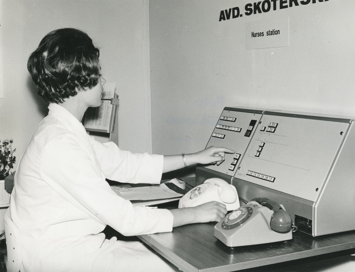 "Fig. 14d. Orderbox för rekvisitioner, hopkopplad med vårdavdelningens teletypewriter. Epidemisjukhusprojektet."