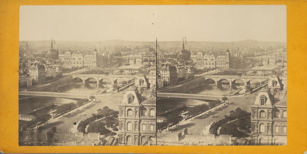 Stereobild med motiv av stadsvy över Paris och floden Seine. Fotograferat innan 1889 eftersom Eiffeltornet saknas i bild.