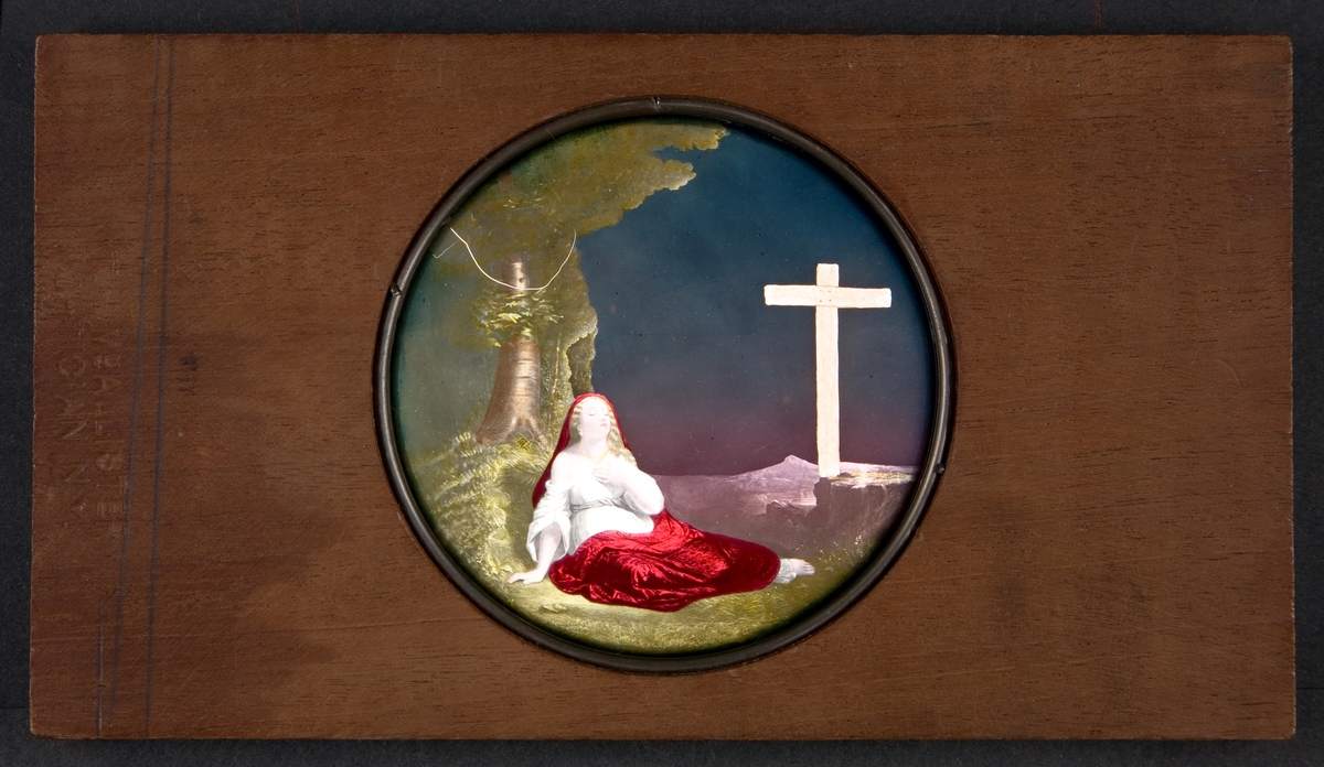 Laterna magica bild i färg på glasskiva.