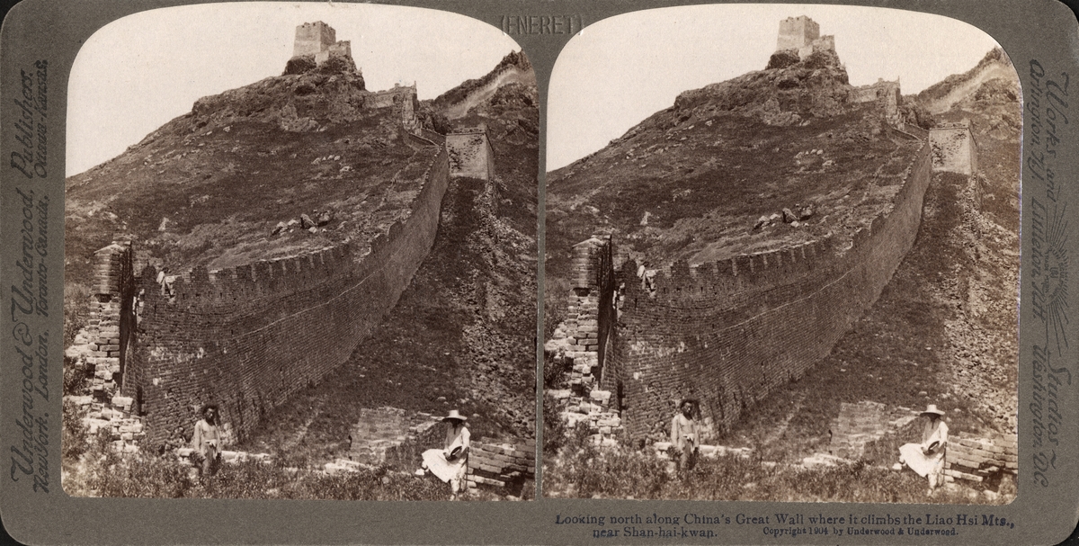 Stereobild av två män vid Kinesiska muren vid Shan-hai-kwan.