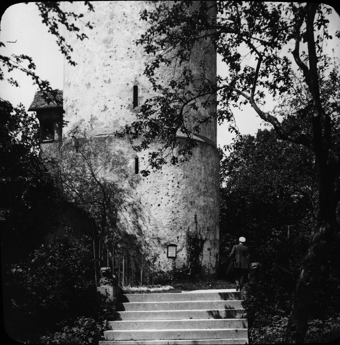 Skioptikonbild med motiv av man på trapp vid Faulturm i Dinkelsbülh.