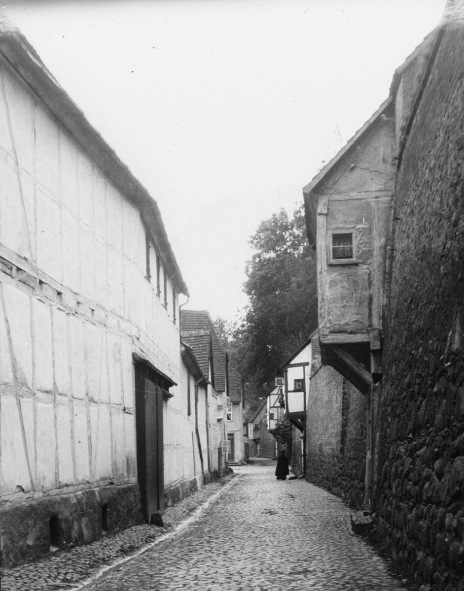 Skioptikonbild med motiv från gränd utanför murarna i Nördlingen.