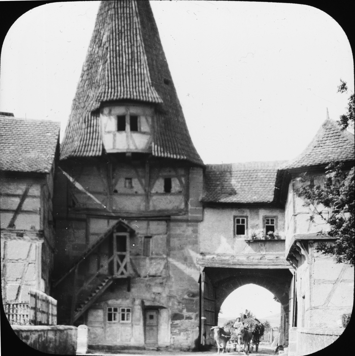 Skioptikonbild med motiv av stadsmursporten Rödelseer Tor, Iphofen.