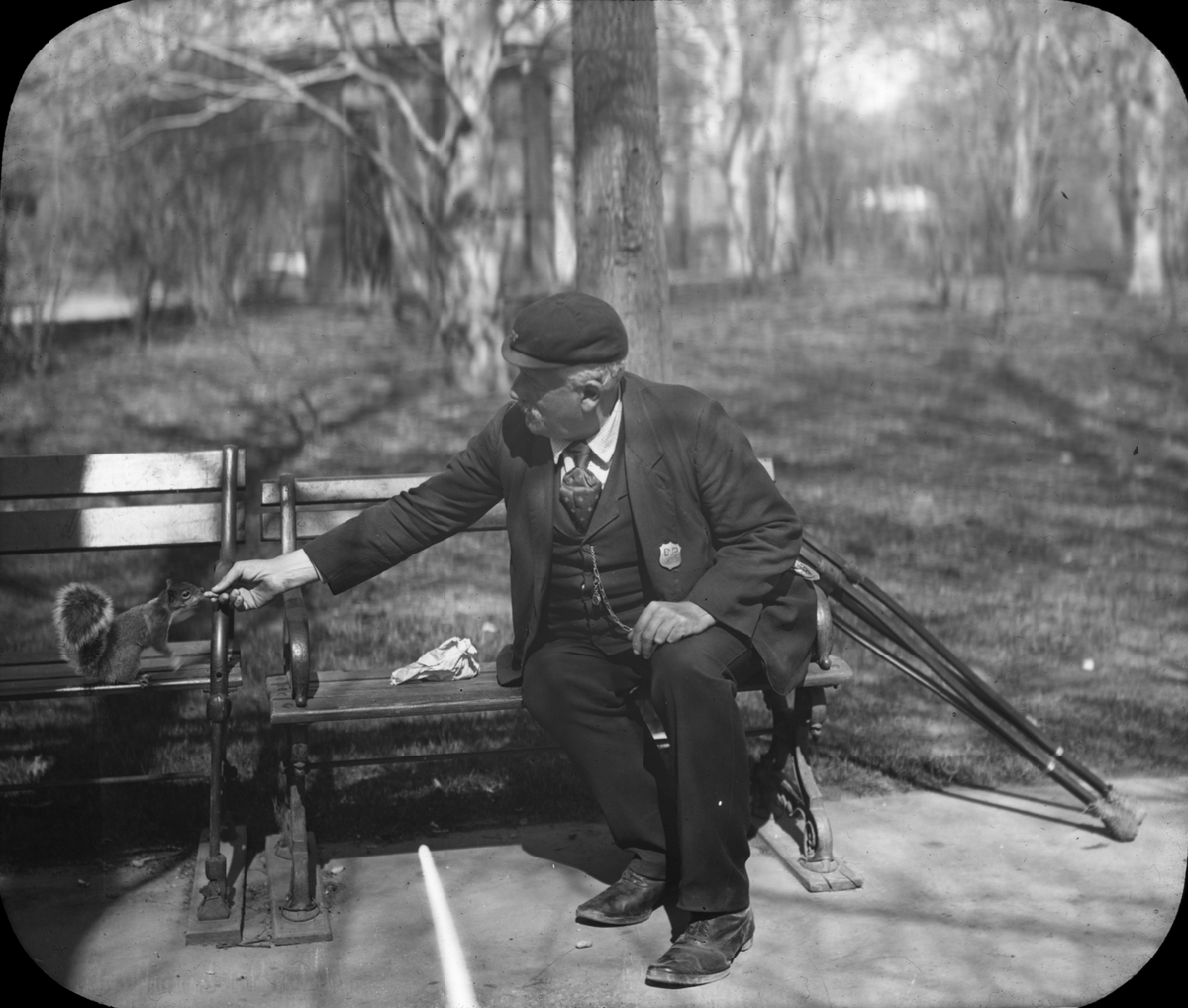 Skioptikonbild med motiv av äldre man som sitter på en parkbänk och matar en ekorre.