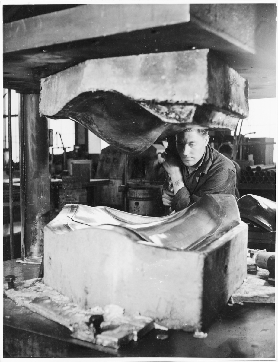 Bild från Svenska Aeroplan AB i Linköping. Mycket krökta plåtar hejas i fallhammare. Hejarvertygen är gjutna av zink-blylegeringar.