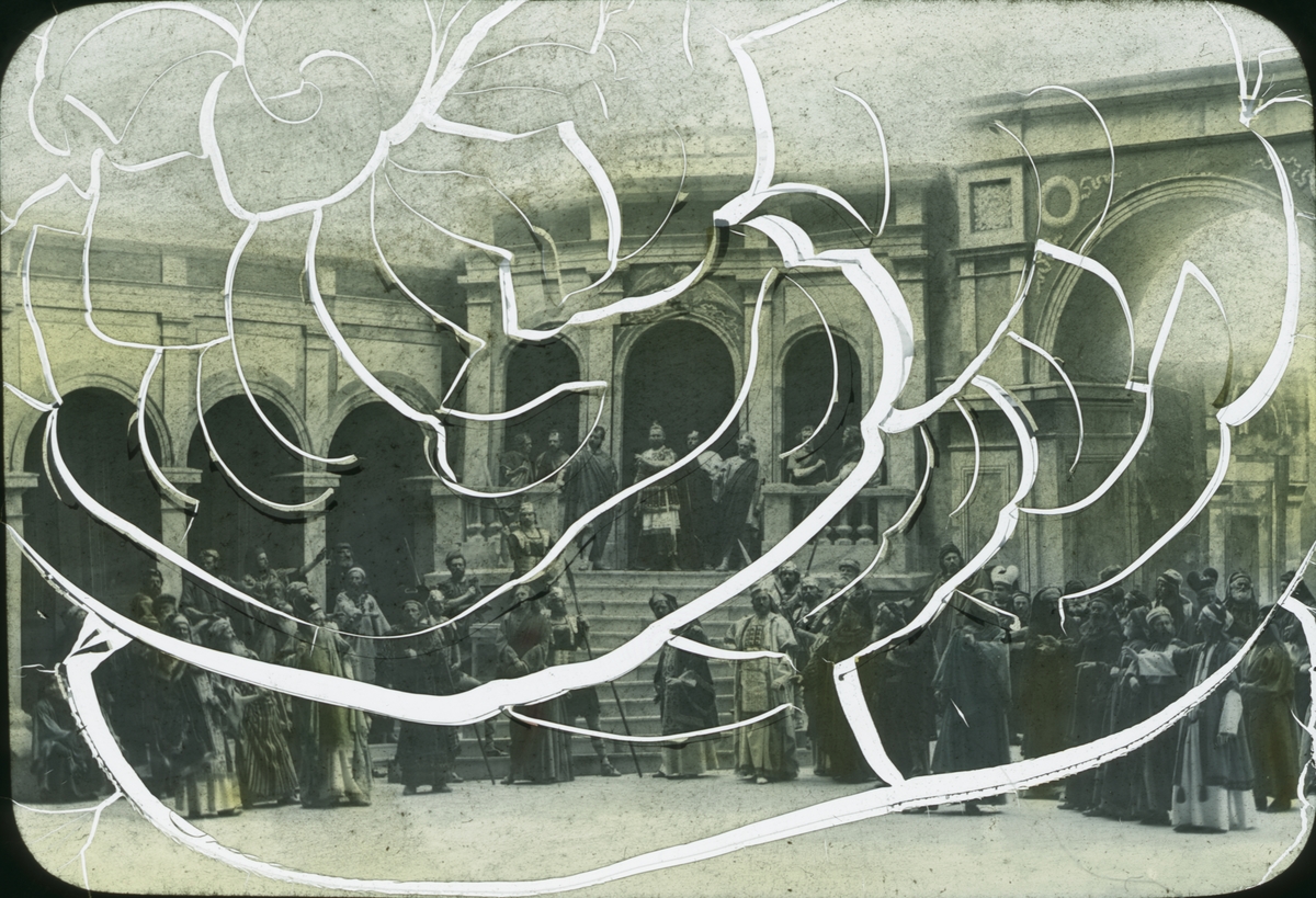 Kolorerad skioptikonbild med motiv, möjligen av romerstkt spel. Bilden scannad pga dess nedbrytning.