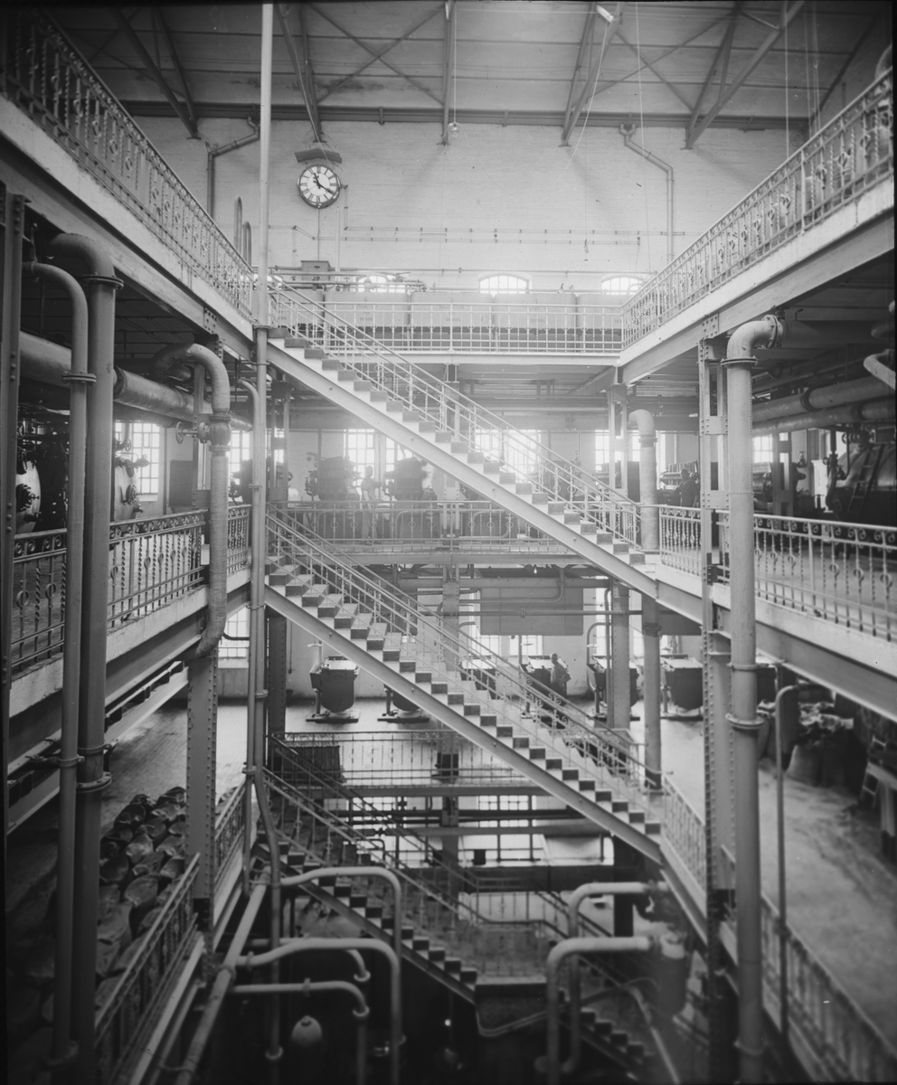 Titel: Skioptikonbild med motiv från yrkesinspektionens undersökningar på olika arbetsplatser.Okänd fabrik. Möjligen tillberedning av sockerbeta.