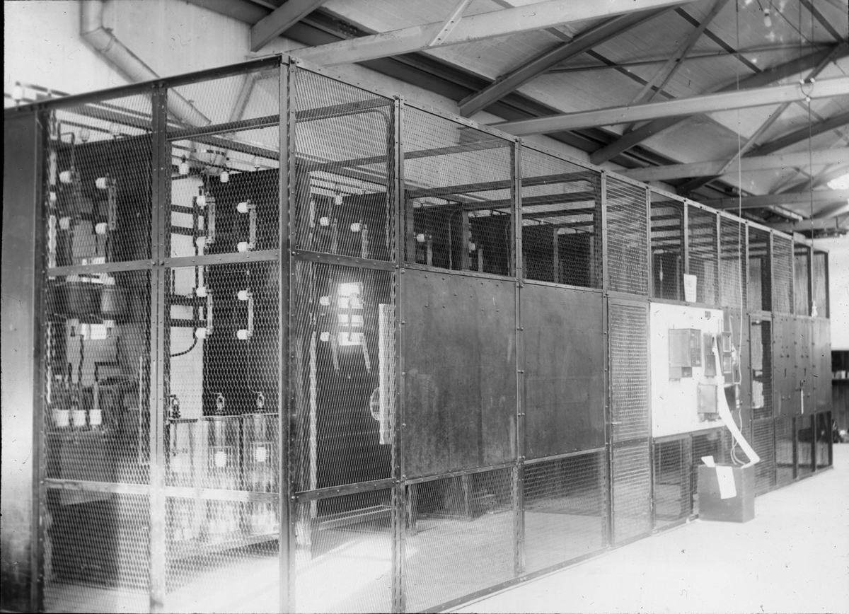 Skioptikonbild med motiv från yrkesinspektionens undersökningar på olika arbetsplatser. Okänd elcentral.