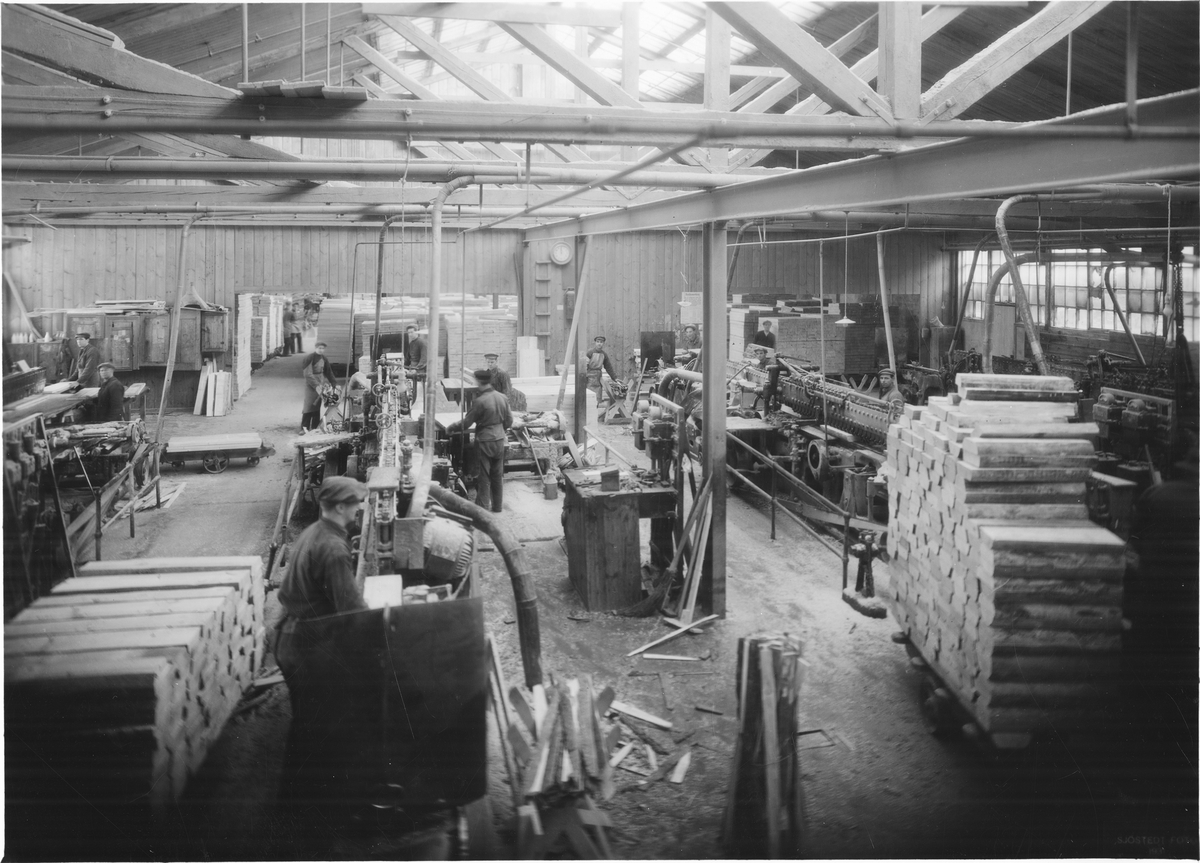Säfveåns Aktiebolag. Interiör. Bräderna sammanfogas till sidor i en av de elva "Liderman"-maskinerna.