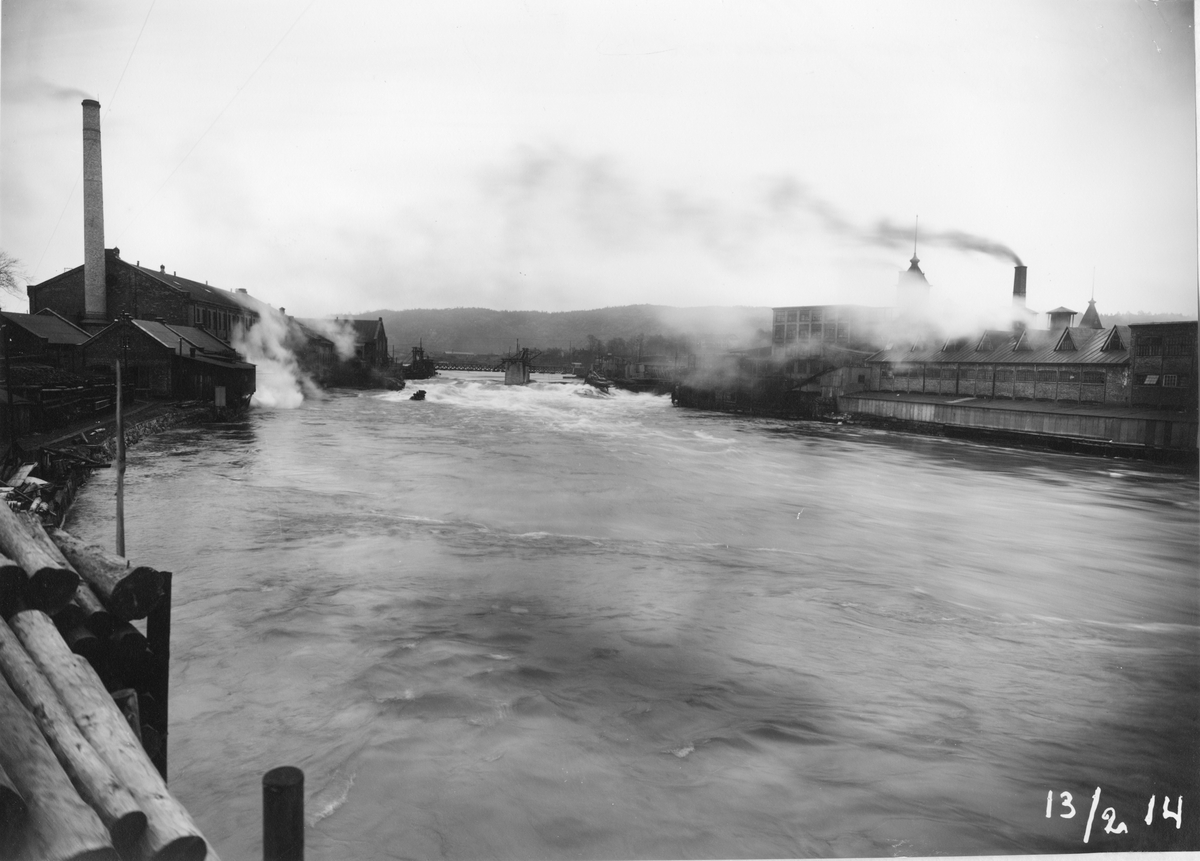 Ombyggnad av Trollhätte kanal, Trollhättan. Nedströmsvy av fallen vid Lilla Edet.