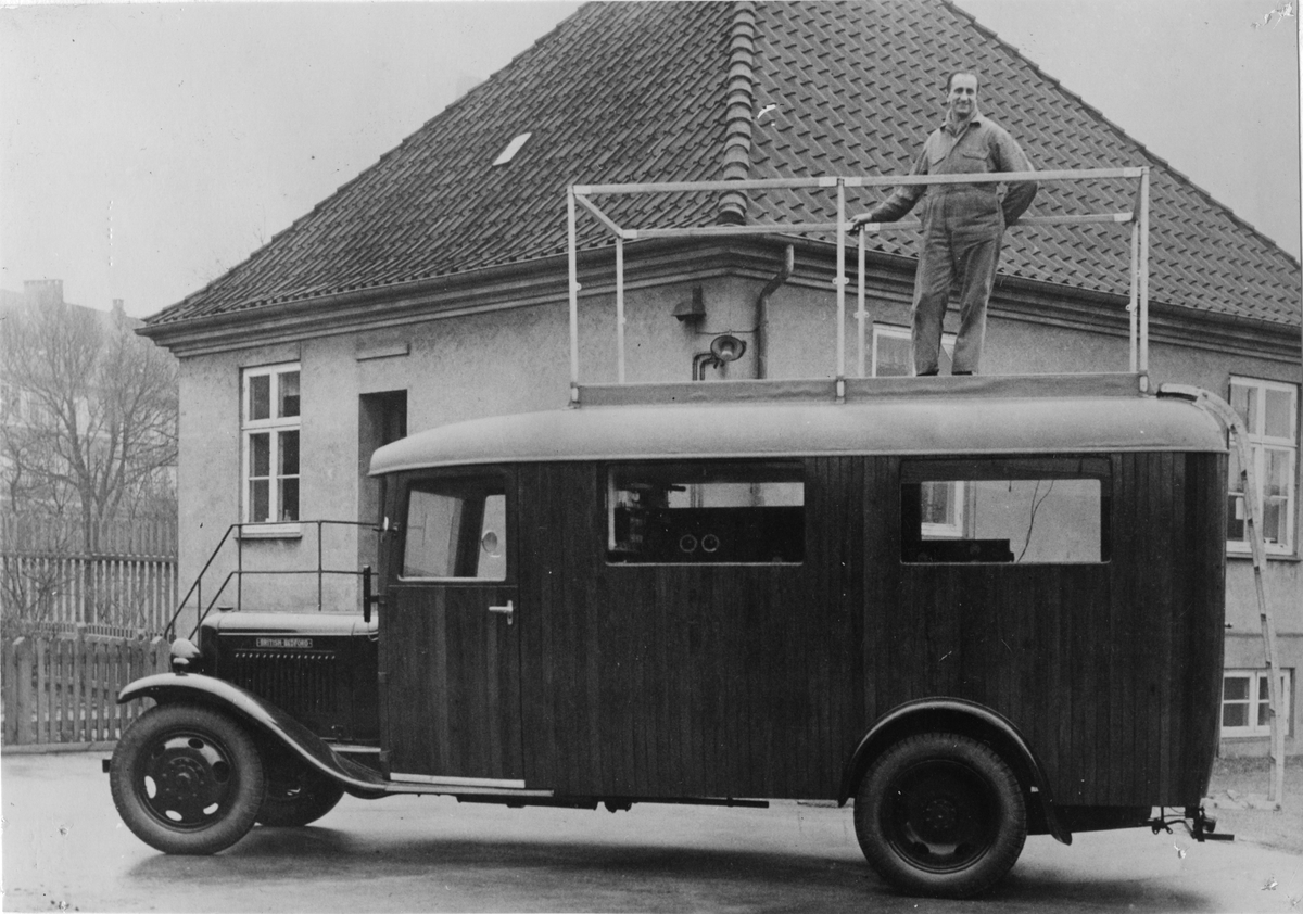 Danmarks Radiotjänsts reportagebil, utrustad med kortvågssändare och plattform för hallåamannen, 1933.