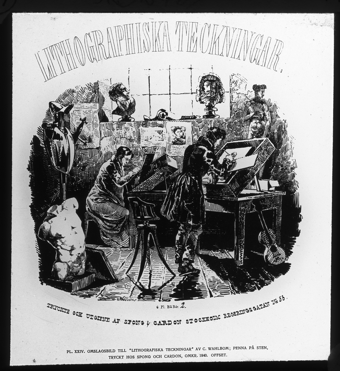 Omslagsbild till "Litografiska Tidningar" av C. Wahlbom penna på sten, tryckt hos Spong och Carbon, omkring 1840. Offset.