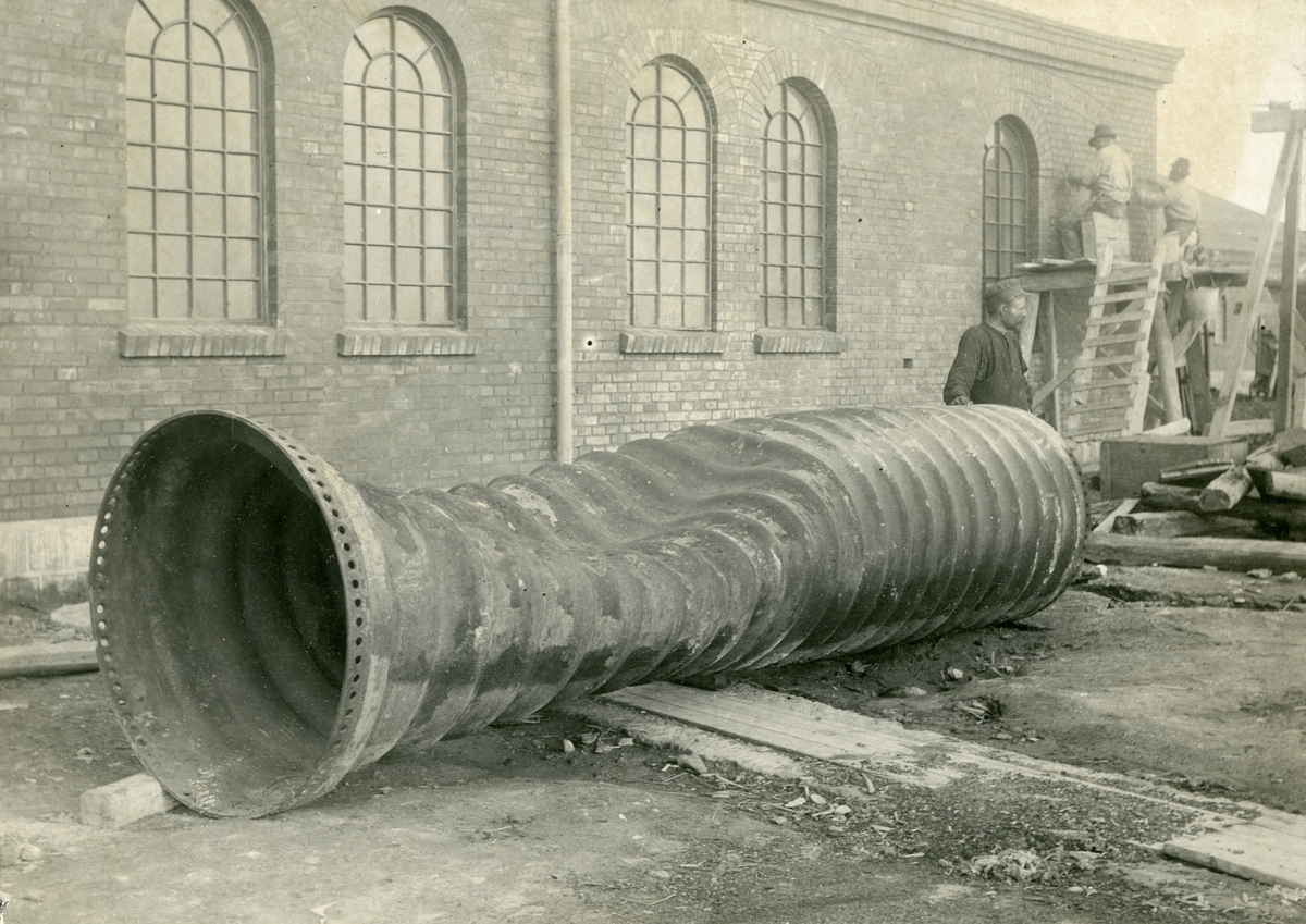 Klagshamns cementfabrik. Nedkokt ångpannekanal, bevisande materialets seghet.