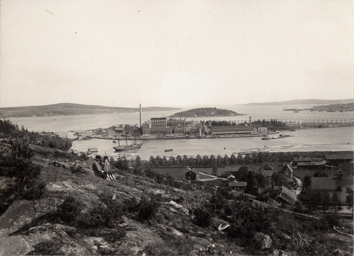 Två pojker på berget. Ortvikens Sulfitfabrik, Sundsvall i bakgrunden.