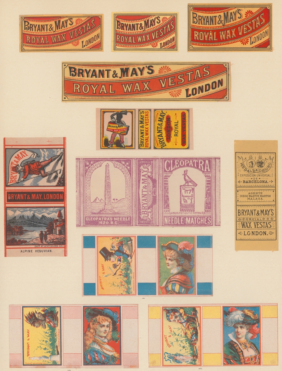 Etiketter för tändsticksaskar, från Svenskt Industri- och Handelsmuseum.