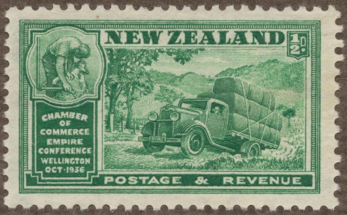 Frimärke från Nya Zeeland, 1936. Motiv av biltransport av ullbalar och fårklippning. "Imperiets handelskongress i Wellington," 1936.
