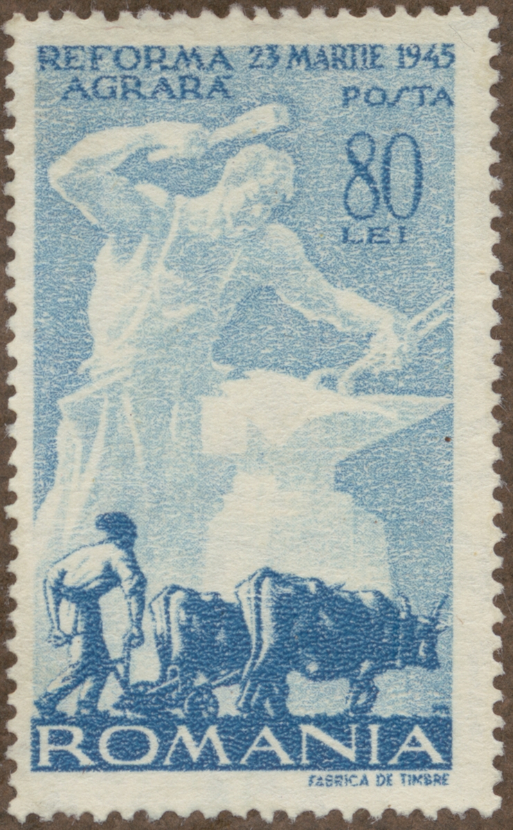 Frimärke från Rumänien, 1946. Motiv av Plöjning med oxar: Smidning av plogjärn -Minne av Agrarreformen 23 mars 1945-