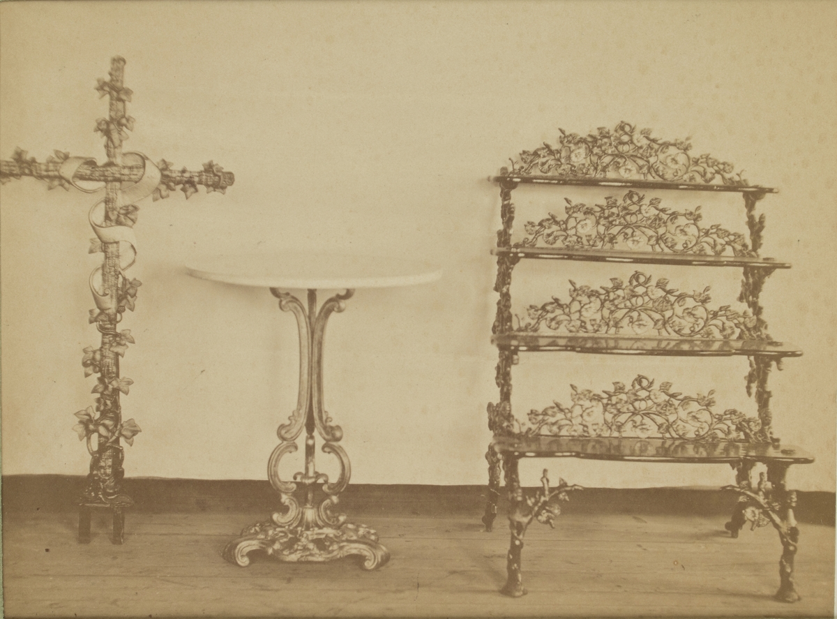 Produkter från Ludwigsbergs Werkstad. Kors, hylla och pelarbord i gjurjärn. Ur album: Ludwigsbergs Werkstads Aktiebolag, Stockholm, Sverige.