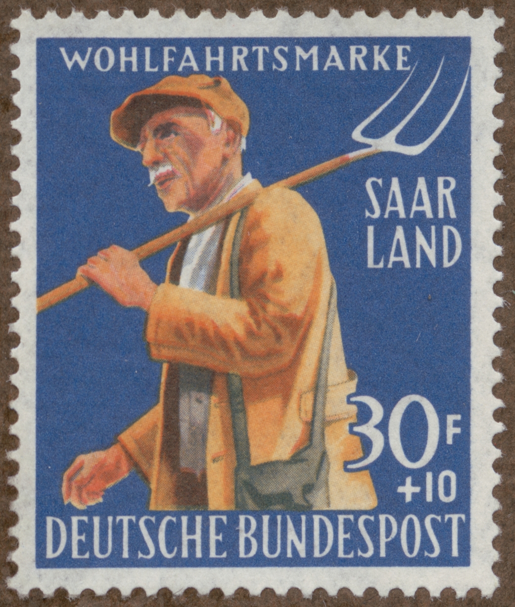 Frimärke från Väst Tyskland, 1958. Motiv av Lantbrukare med grepe