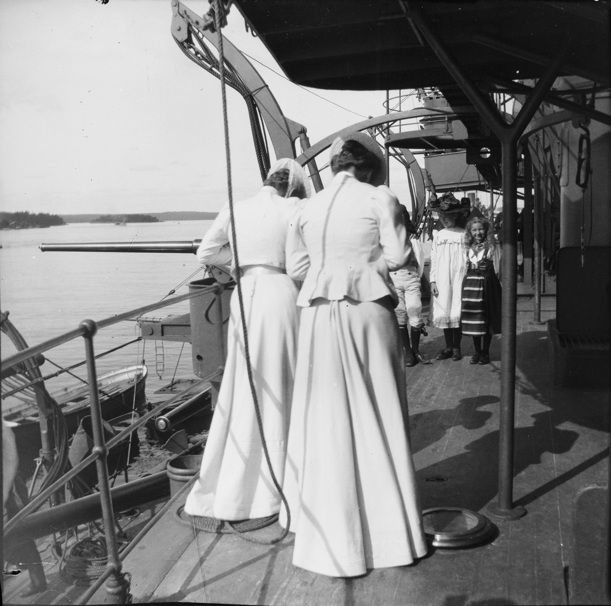 Drottning Victoria bilder. Flickor på båt poserande inför flera fotografer. Barn i svenska folkdräkter.