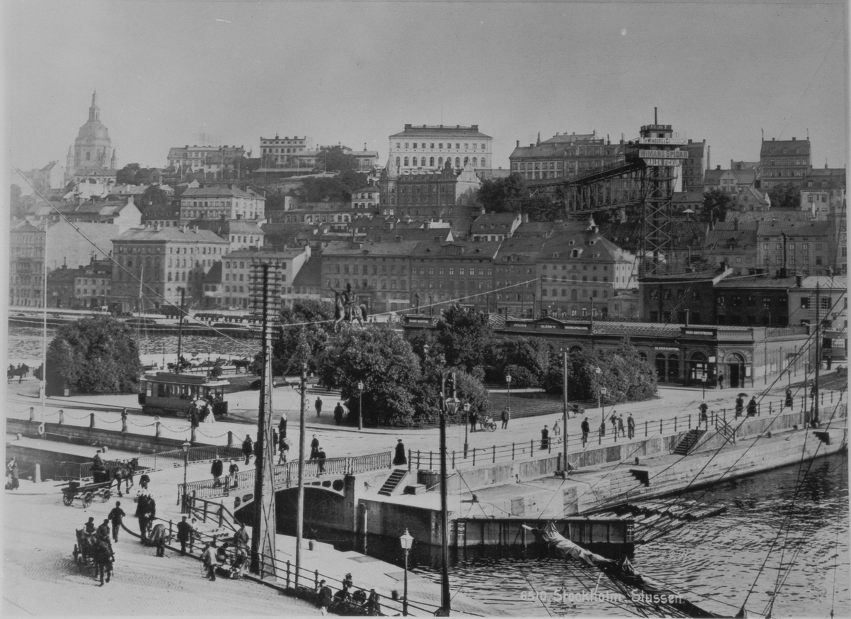 Slussen i Stockholm med de av J.E. Eriksson uppsatta bågljuslamporna på stolpar i förgrunden. Foto från 1890-talet i Stockholms Stadsmuseum.