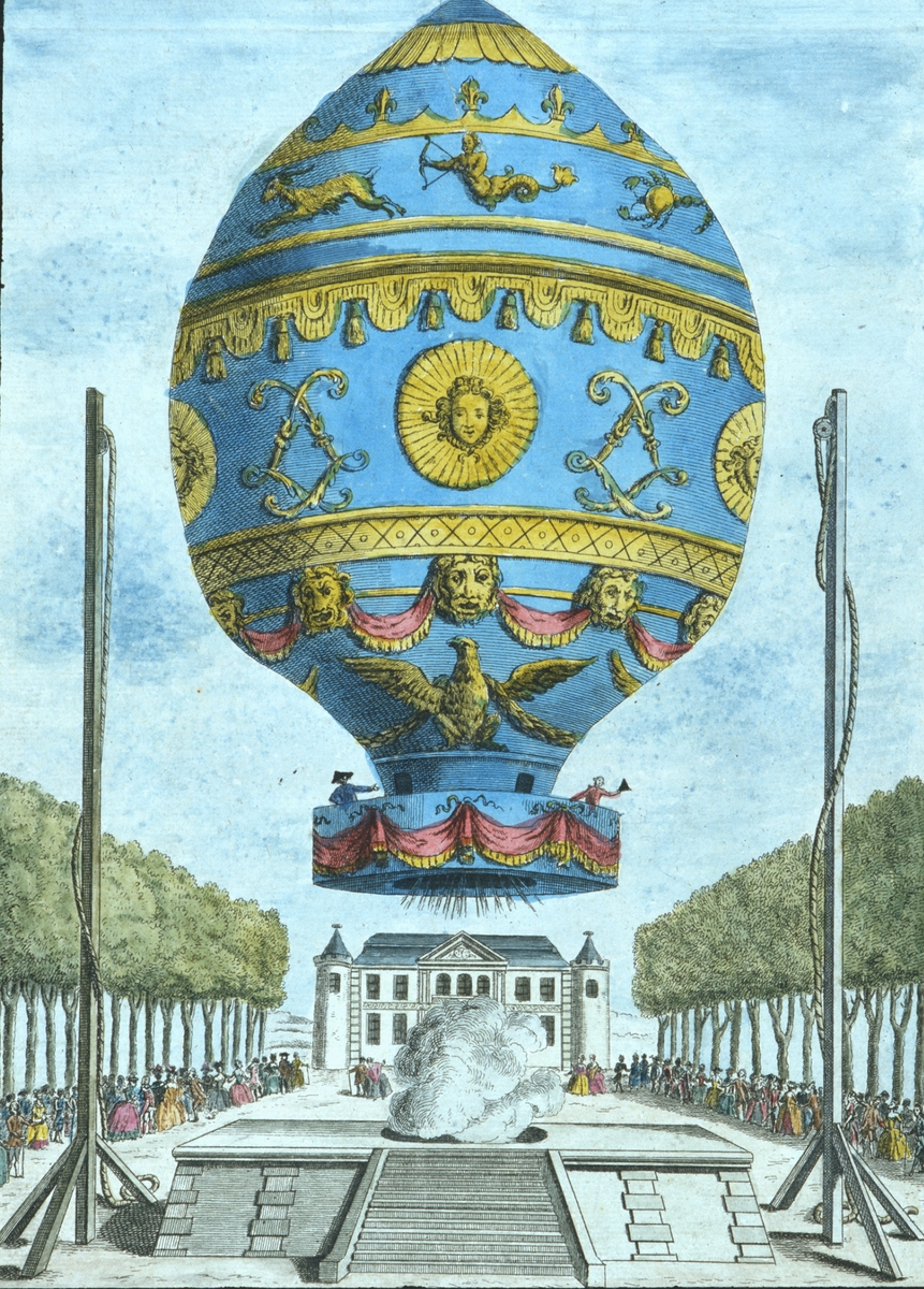 Fransmännen Rozier och d'Arlandes i en varmluftsballong utanför Paris den 21 november 1783. Montgolfiers konstruktion.