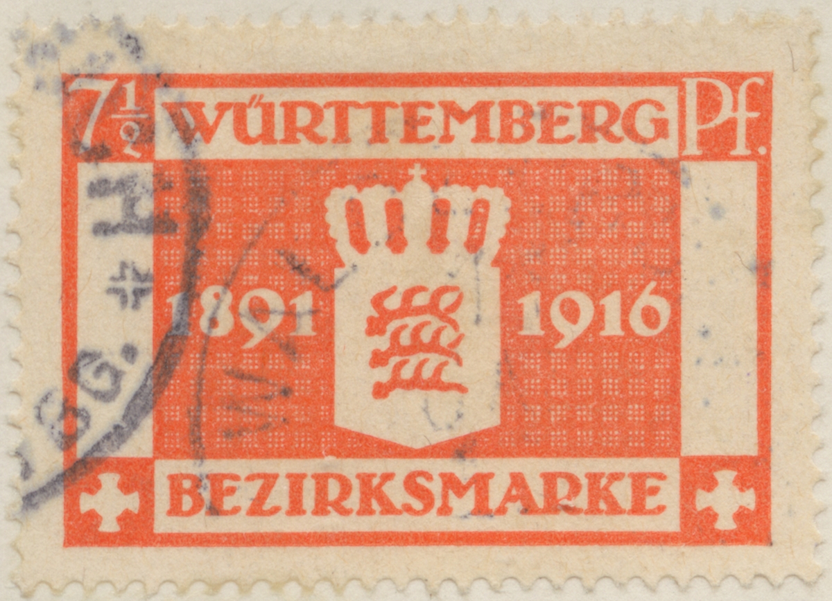 Frimärke från Württemberg, 1916. Motiv av Württembergs Landsvapen -Minne av Kejsare Wilhelm II:s 25-årsregeringsjubileum: 1891-1916.