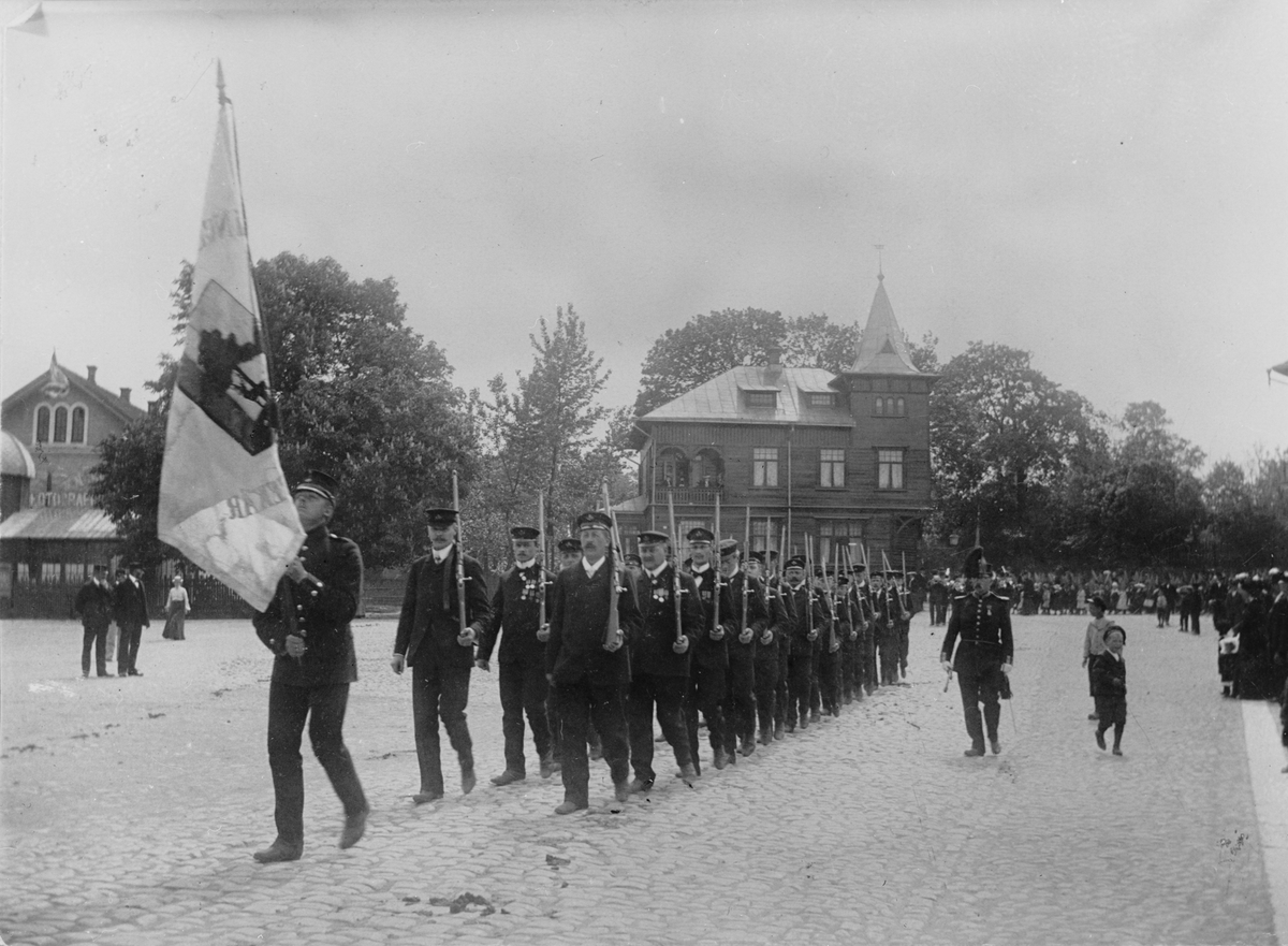 Alingsås Skarpskyttskår på marsch genom Alingsås. Bild från tidskriften Hemmets bildmaterial.
