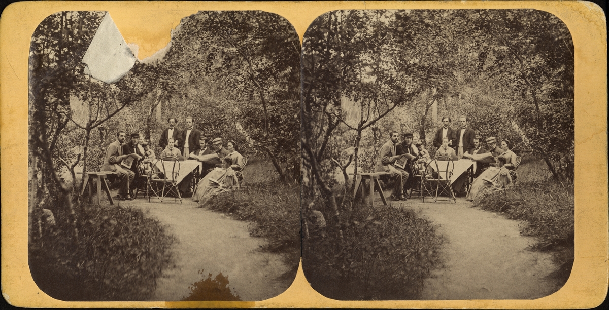 Stereobild av sällskap som fikar i dunge, Blommensberg 1868.