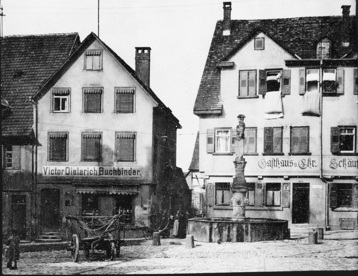 Skioptikonbild med motiv av fontän på torg vid bokbinderi i Besigheim.