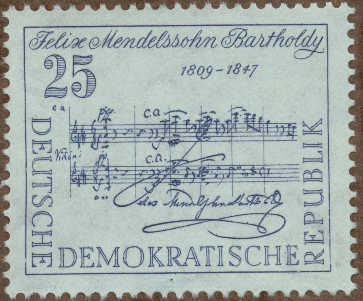 Frimärke från Östtyskland, 1959. Motiv av notskrift - reproduktion av musikstycke av kompositören Felix Mendelsohn Bartholdy: 1809-1847. "150-årsminne av Mendelsohns födelse: 1809-1959".