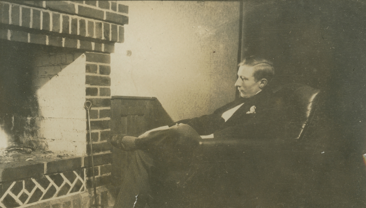 Fotografi från expedition till Spetsbergen. Motiv av man som sitter framför eldstad.