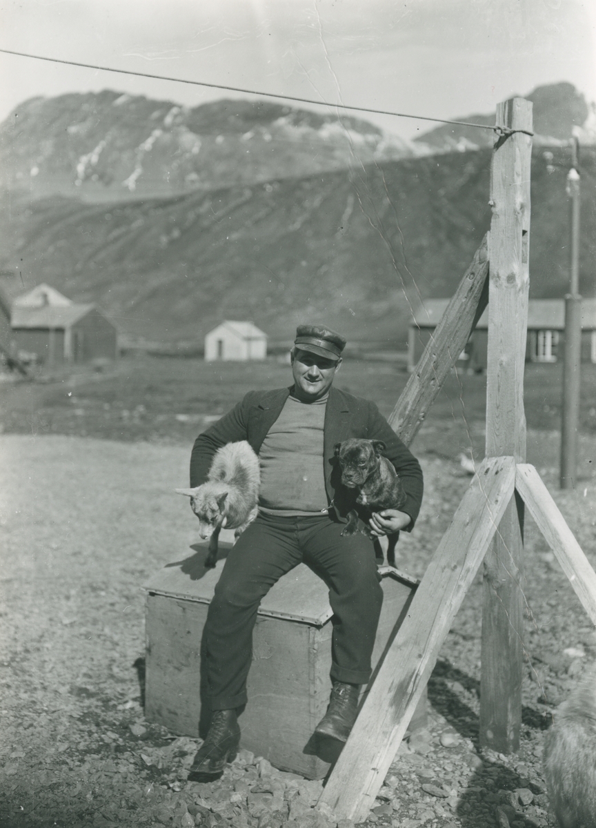 Bild från expedition i Antarktisområdet. Motiv av man som håller i två hundar.