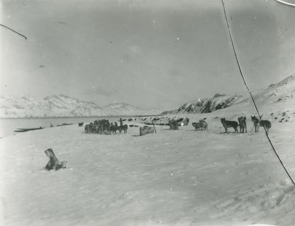 Bild från expedition i Antarktisområdet. Motiv av hundspann i snölandskap.