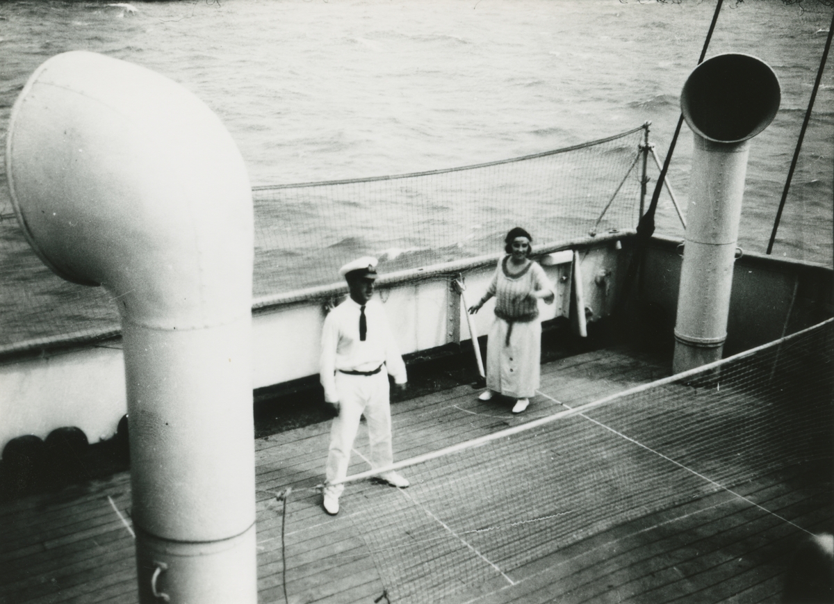 Bild från expedition i Antarktisområdet. Motiv av sjökapten och kvinna ombord på båt.