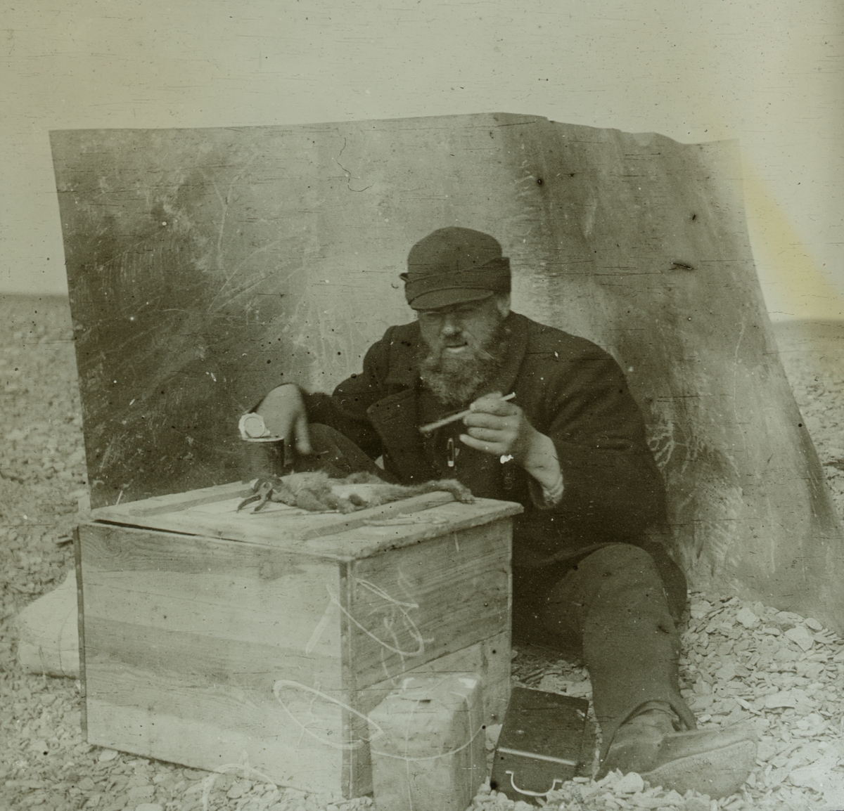 Fotografi från expedition till Spetsbergen. Motiv av man som studerar död fågel.
