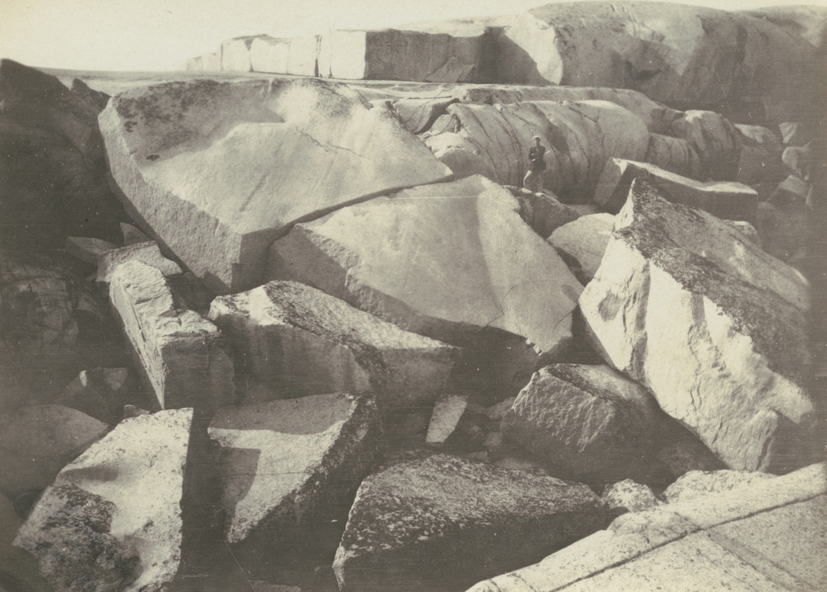 Diverse bilder från Fred Goldbergs samling. Motiv av man som står bland stora klippblock.