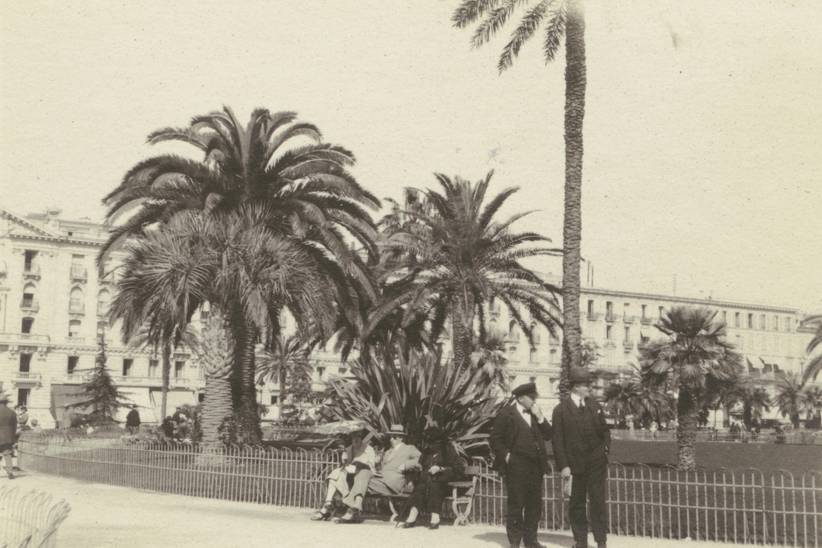 Fotografi från Albin Ahrenbergs resa till Grönland 1929. Motiv av personer vid park med palmer.