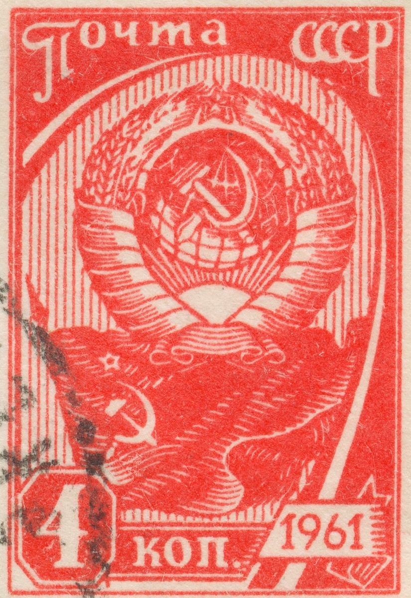 Frimärke från Ryssland, 1961. Motiv av tryckt frimärke med CCCP's Coat of Arms och röda fanan, på kuvert till "Förstadagsbrev 12.2.1961. Med bild av Venera 1 rymdskepp uppskjutning för flygning mot Venus på kuvert. Även TEKA 0221285, från uppskjutning 12.4.1961. Saknar förstadagsstämpel.