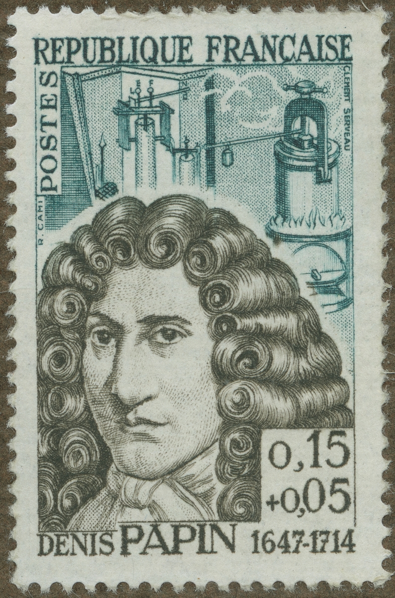 Frimärke från Frankrike, 1962. Motiv av Denis Papin 1647-1713. Fransk fysiker och uppfinnare Konstruerade 1681 kokkärl, s.k. "Papins gryta" (=autoklav) Konstruerade 1690 första ångmaskinen med cylinder och piston. "Serie: "Berömda fransmän":" till förmån för Röda Korset.