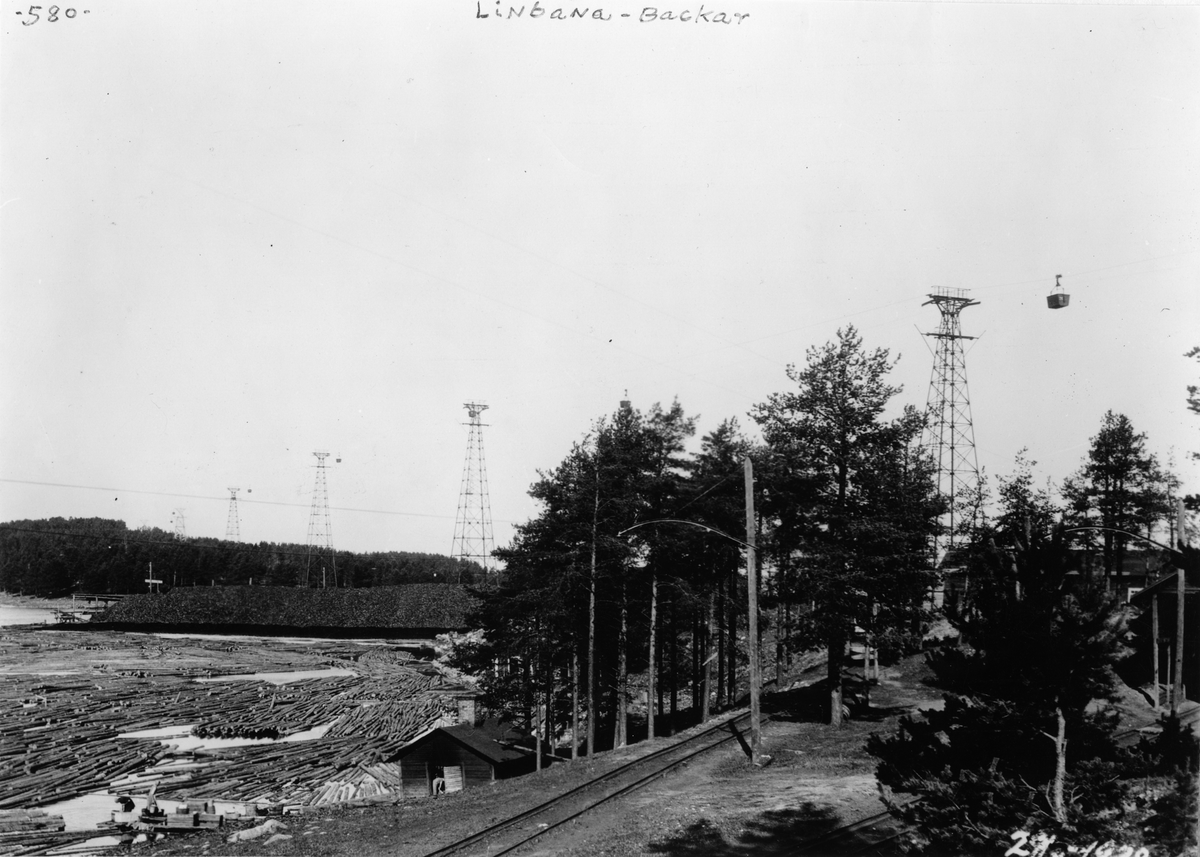 Linbanebackar av järn över farled vid Munkfors sulfitfabrik. Linjens längd 6900 meter. Nivåskillnad mellan ändpunkterna 20 meter, Transportförmåga per timme 130 kubikmeter, det vill säga 46 ton. Nettolast per vagn 1,5 kubikmeter flis. Transporthastighet 2 meter per sekund. Banan är utförd under åren 1926-1927 av AB Nordströms Linbanor, Stockholm.