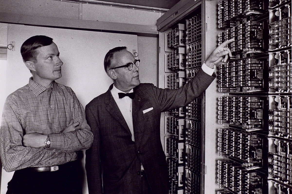 Ungskär Telefonstation. Dc Moberg visar telefonbiträde Knut Andersson finesser i automatväxeln.